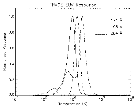 The wavelength response of the TRACE optical and UV channels is shown in Figure 3.2, and of the EUV channels in Figure 3.3. The temperature response of the TRACE EUV quadrants are shown in Figure 3.4.